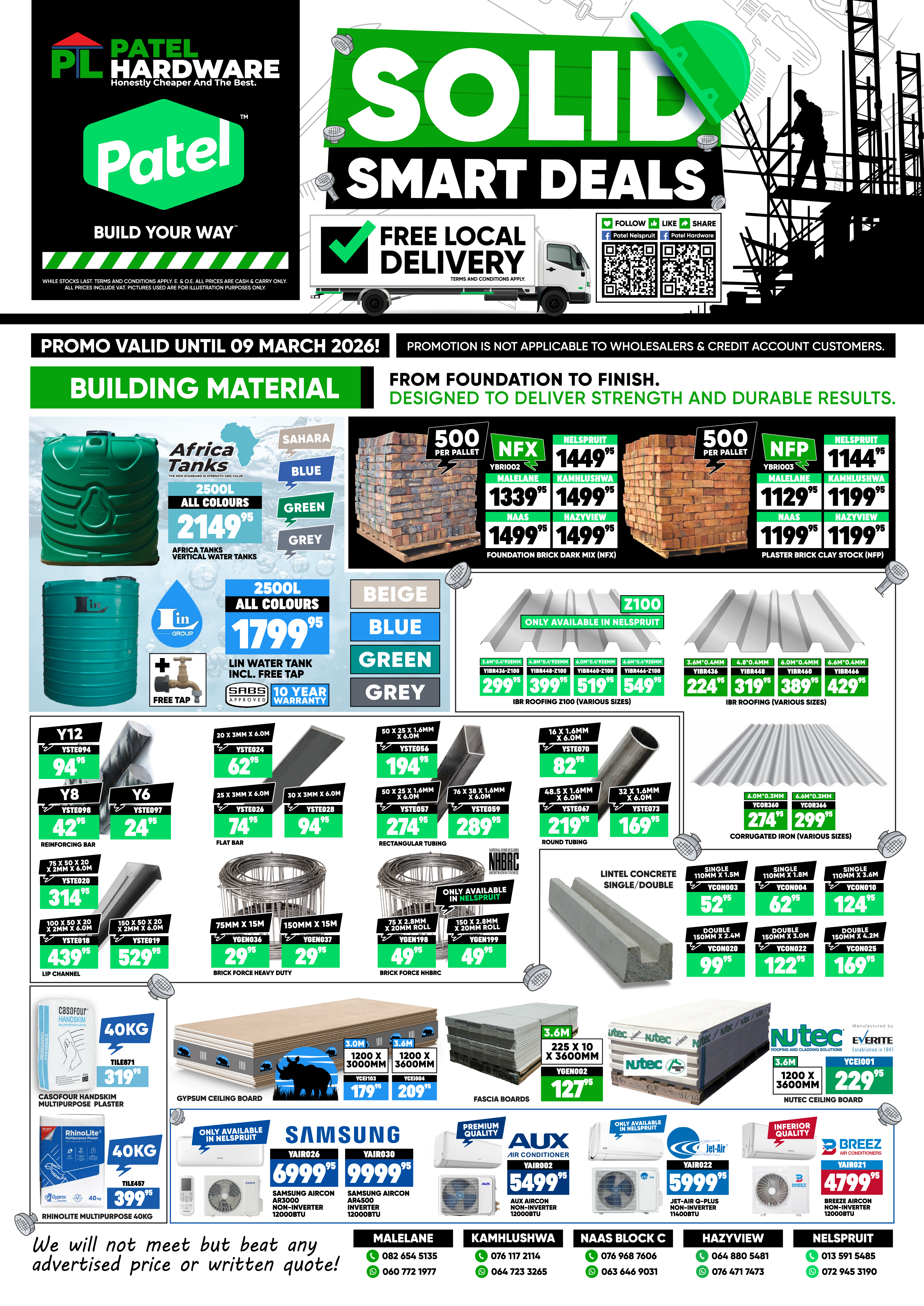 Stock up on bricks, roofing, doors, aluminium windows, electrical, aircons & more — all at seriously smart prices.